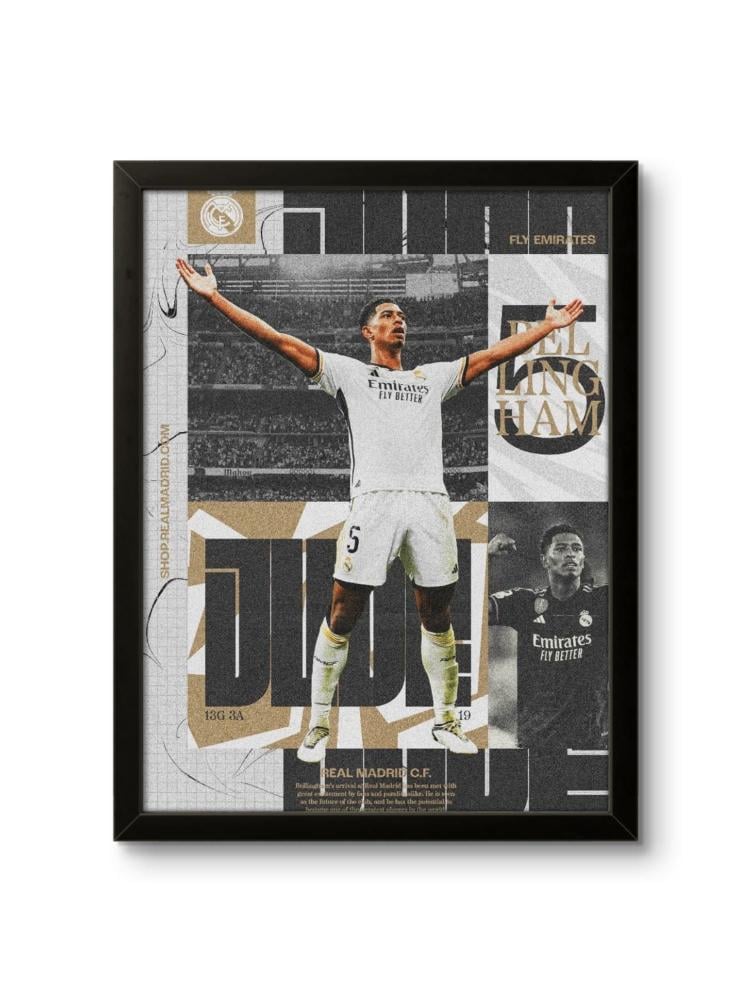تجسد الصورة جود بيلنغهام وهو يحتفل بانتصاراته مع ريال مدريد، في لحظة تجمع بين القوة والشغف، مما يعكس مستقبله الواعد في النادي.