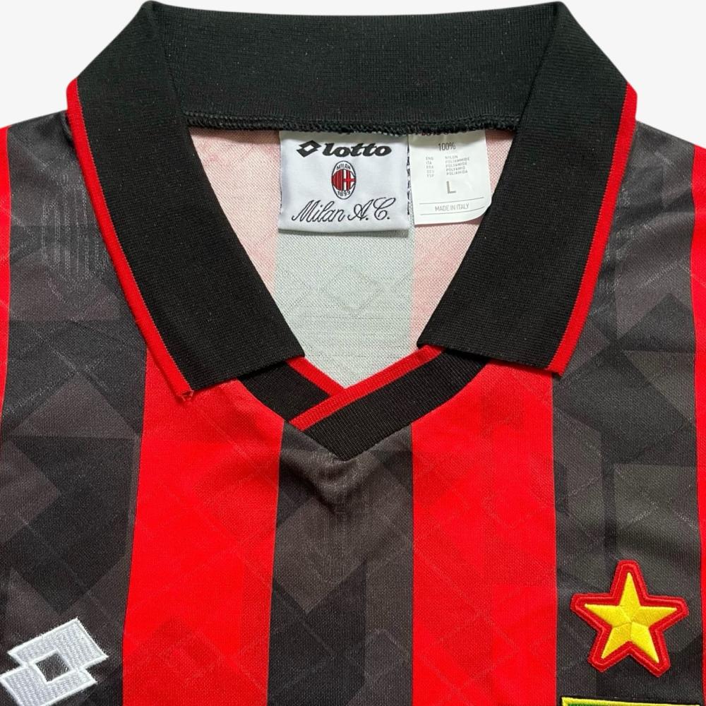 ارجع بالزمن إلى حقبة المجد مع قميص إي سي ميلان الأساسي لموسم 1993/1994، من تصميم Lotto، والذي ارتداه عمالقة اللعبة في فترة هيمنت فيها ميلان على أوروبا.